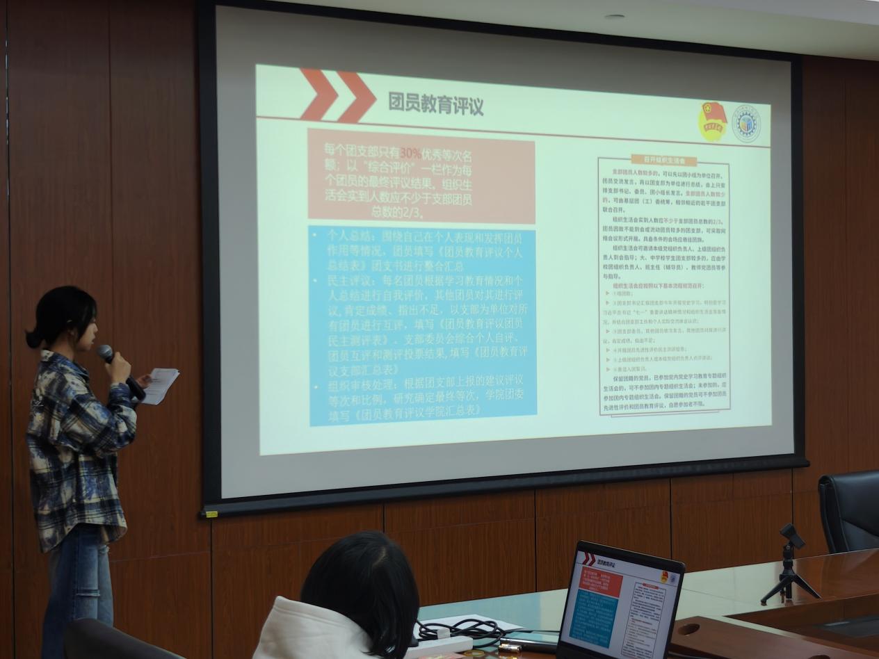 交流会在庄严的《中国共产主义青年团团歌》中启幕。团务培训环节,学院团务部负责人严梦泽聚焦核心业务开展系统讲授。围绕 “智慧团建”系统实操、团员发展流程、团费收缴管理、团组织活动备案等重点内容,通过案例演示与流程拆解,精准解答新任团支书可能面临的工作难点,帮助其快速掌握基础团务知识,为后续工作规范化开展筑牢根基。