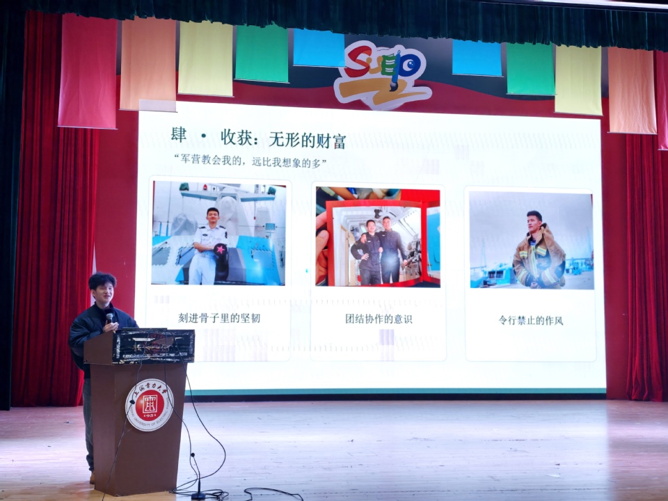 为让宣讲更具针对性、更富感染力,学院特别邀请优秀退役老员工士兵赵鸿宇分享自身经历。他以自身入伍经历为切入点,生动讲述了从入伍初心的确立,到军营里训练生活的点滴日常,再到返校后的成长蜕变,用真实的故事、真挚的感悟,展现了军营生活对个人意志品质、责任担当的锤炼与提升。他坦言,军营是青春最耀眼的舞台,参军经历不仅是人生中宝贵的精神财富,更让他学会了坚守与担当。他鼓励在场同学勇敢迈出步伐,选择军营、奉献青春,收获不一样的人生历练。