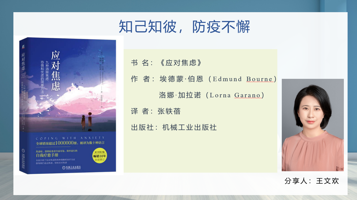 王文欢、彭程、王昊三位老师分别从“知己知彼,防疫不懈”、“放下行囊,寻找真我”、“同理陪伴,终身成长”方面分享了《应对焦虑》、《贪婪的多巴胺》、《非暴力沟通》三本书。他们从当前疫情下大家面临的焦虑情绪谈起,分享了引导式内观、渐进式肌肉放松、停止忧虑之解离法等应对焦虑的方法;从多巴胺对个人的积极与消极的两方面作用,传递了善于利用多巴胺、并不为其所控的不断完善自我的方法;从非暴力沟通四要素(观察、感受、需要和请求)鼓励老师们积极实践“非暴力沟通”,把良好的沟通方式应用到家庭、工作和社会生活中。