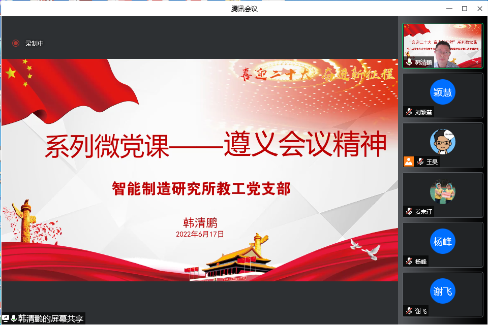 此次活动是由智能制造研究所教工党支部筹划发起的。该支部作为上海市教卫党委示范点建设党支部,在实际工作开展中,探索总结出“党建+N”的工作模式。在完善制度型建设的基础上,为进一步推进创新型、学习型、示范型支部建设,组织筹划了“喜迎二十大、奋进新征程”系列微党课以及“共读一本书”系列活动。系列微党课以伟大建党精神入手,按照新民主主义革命时期、社会主义革命和建设时期、改革开放和社会主义现代化建设时期、中国特色社会主义新时代四个篇章的顺序进行每月微党课展示。