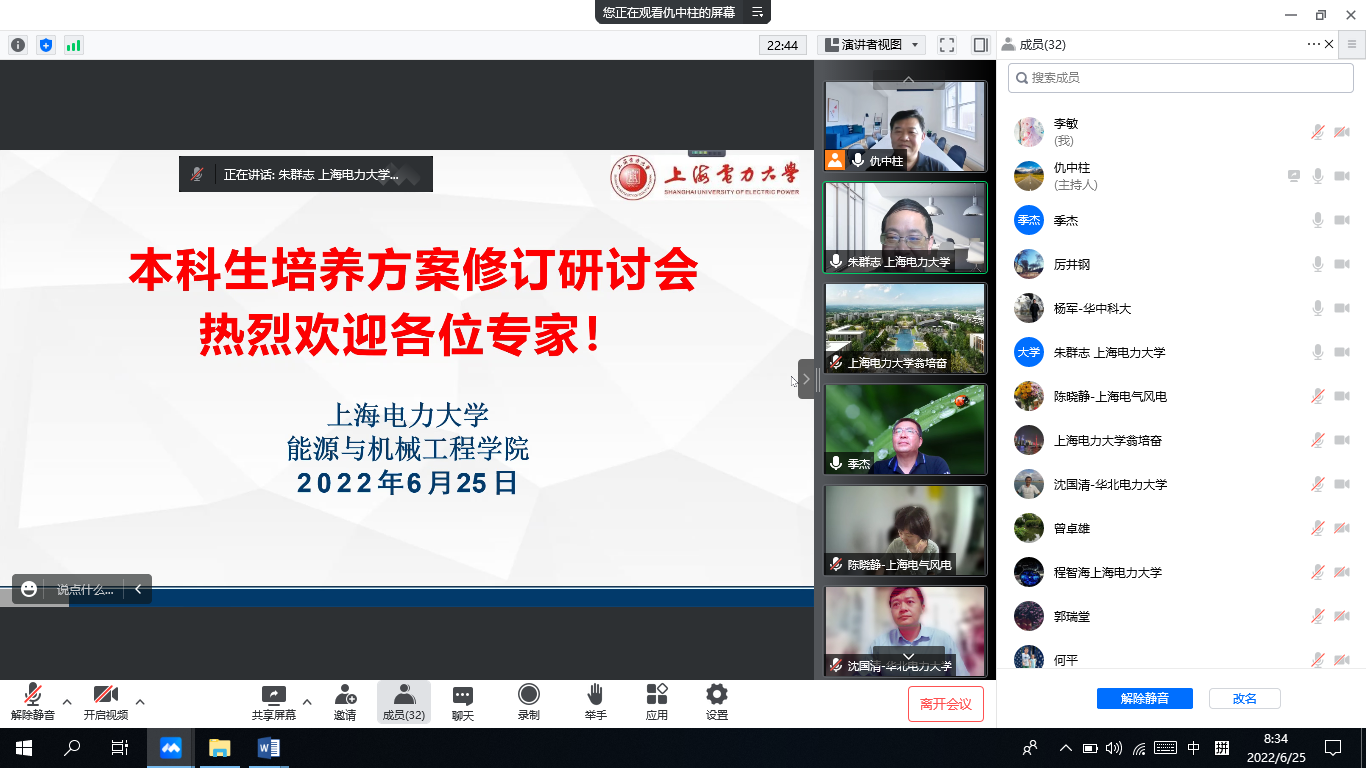 为深入推进本科人才培养方案修订工作,进一步优化专业人才培养方案,全面提高人才培养质量,2022年6月25日学院在线上召开2022版能动类专业和机械类专业六个专业人才培养方案专家研讨会。研讨会邀请到了上海交通大学孙方宏教授、中国科技大学季杰教授、华中科技大学杨军教授、华北电力大学沈国清教授、上海电气风电集团股份有限公司陈晓静教授级高工等11位高校和企业专家。公司公司党委副书记翁培奋、公司党政班子、学院教学工作委员会、各专业培养方案修订工作小组成员、主干课程负责人参会,会议由经理朱群志教授主持。