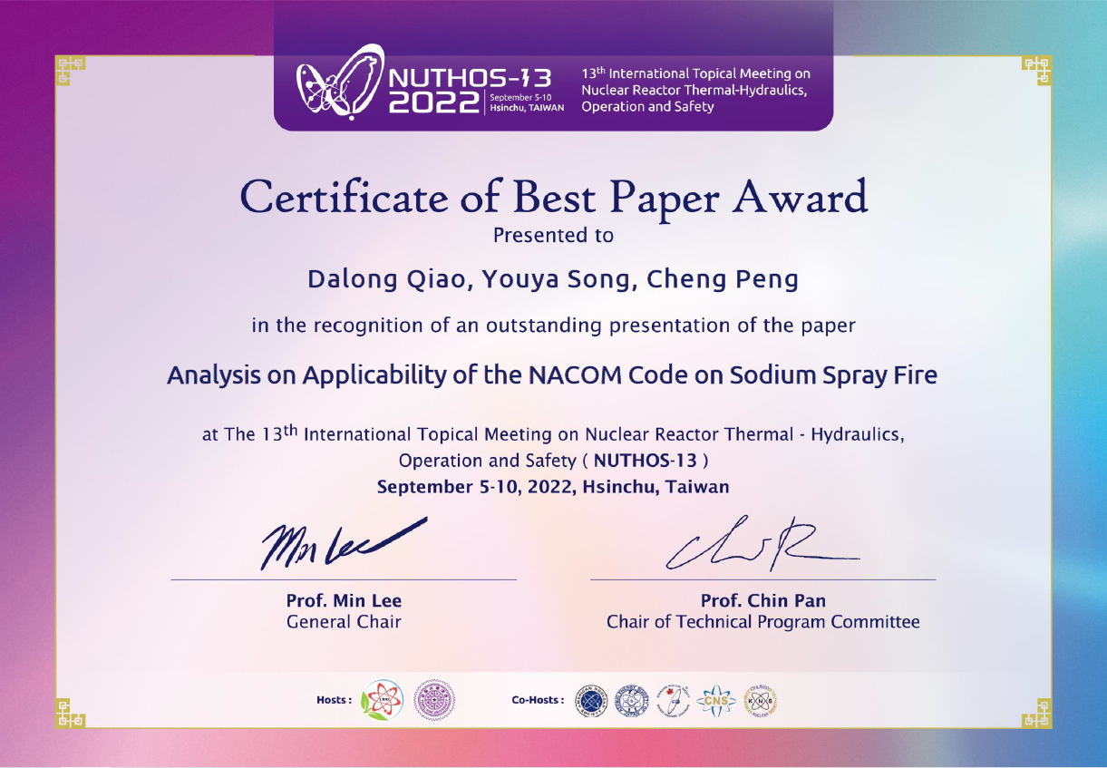 由于疫情影响,本次会议采用线上报告与交流形式。受组委会聘任,彭程博士作为热工水力与先进反应堆安全组的Session Chair主持了整场报告,同时就其论文“Analysis on Applicability of the NACOM Code on Sodium Spray Fire”进行了宣讲,并同与会学者进行了讨论。结合组委会针对“论文质量+宣讲质量+问题交流”三项成绩的综合评定,最终该论文获得本届大会的“最佳论文奖”。论文第一作者为乔大龙,是彭程老师指导的硕士研究生。该研究针对快堆安全中的钠雾火事故进行了详细分析,抓住了其中涉及的喷雾动力学、相变沉降动力学及预混燃烧三个关键问题,通过理论建模与程序分析,预期为钠冷快堆安全分析提供重要的技术支持。相关工作受到国家自然科学基金青年基金(12105167)及上海市青年英才扬帆计划(21YF1414800)共同资助,部分研究成果已陆续发表在International Communications in Heat and Mass Transfer(Cheng Peng*, XianpinMeng, Deng Jian*, et al. Theoretical modeling of the drag reduction influenced by film boiling heat transfer on a spherical body [J].International Communications in Heat and Mass Transfer, 2022, 134:106028.),Nuclear Engineering and Design(Cheng Peng*, DalongQiao, Dong Li, et al. Liquid spray modeling under sodium fire accidents [J]. Nuclear Engineering and Design, 2021, 379:111260.)等业内一流期刊。