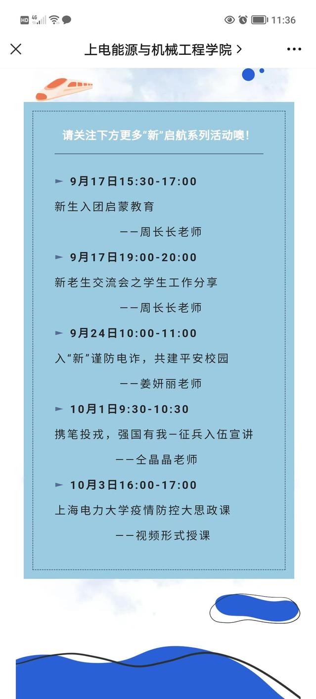 “新”启航特色教育系列活动涵盖了入党启蒙、团员教育、安全教育、校园生活、征兵动员和思政教育等一系列丰富多彩的主题内容。在疫情防控常态化管理期间,活动主要以线上形式开展,除借助腾讯会议平台外,同步启用“上电能机EM”微信视频号开展直播互动,内容丰富、形式新颖的一系列活动得到了同学们的一致认可。