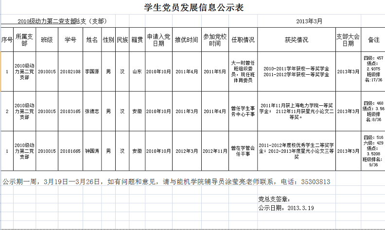 2010级动力第二员工党支部党员发展公示表