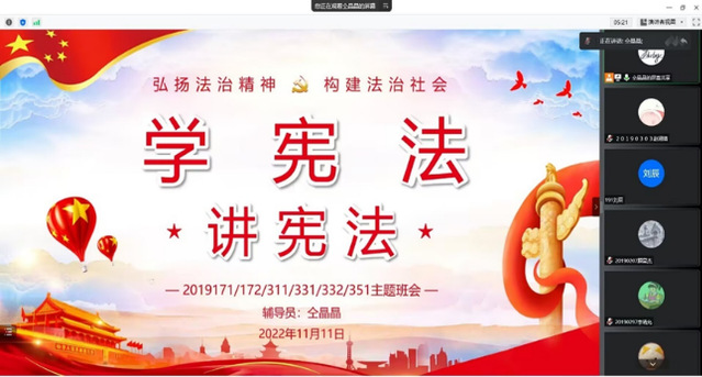 为促进广大青年员工领会我国宪法的重大意义、基本内容和主要精神,11月7日至11月18日,各年级辅导员聚焦于青年学子法治需求和关注的热点问题,围绕宪法教育、民法典、教育法律法规等方面,充分依托主题班会、团课讲堂等阵地开展主题宣讲,通过宪法知识讲解、观看微电影、“我对宪法说句话”等多种形式,引导员工了解宪法知识,树立和巩固国家安全意识、诚实守信意识,推动法治教育与青年学习成长成才实现“同频共振”。通过这次主题宣讲,切实增强了员工的法治观念,提升了广老员工的法治意识。