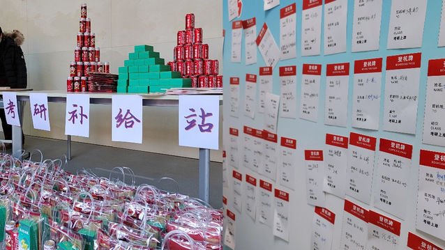 老师们精心设计制作的考研“加油包”里不仅有学习必备的文具套装,还有牛奶、暖宝宝、可乐、定胜糕等物品,分别寓意着“牛气冲天”、“暖心相随”、“动力满满”、“百战百胜”,为考研学子加油助力,考研员工在做好个人防护的前提下分批次前往领取。