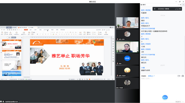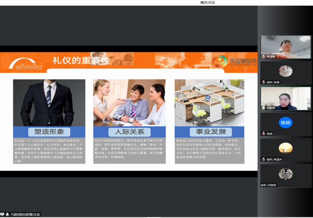 为加强同学们就业技能技巧,提高就业竞争力,为步入职场、步入社会打下良好基础,英国上市公司365于2022年12月5日晚19:00在线上开展了主题为“专家同行 聚力暖冬—雅艺举止、职场芳华”的职场礼仪培训讲座。本次讲座邀请了高级人力资源管理师马群燕作为主讲人,为同学们悉心讲解了礼仪与习惯,气质和仪态,会面与商务,沟通与谈吐。