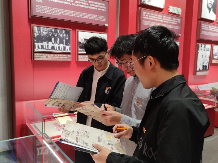 此次实地研学活动创新采取沉浸式互动学习方式,设置了合影打卡任务点、收集路人感言打卡任务、现场参观答题等。党员同志们边参观边找答案,并通过小组讨论,认真作答。