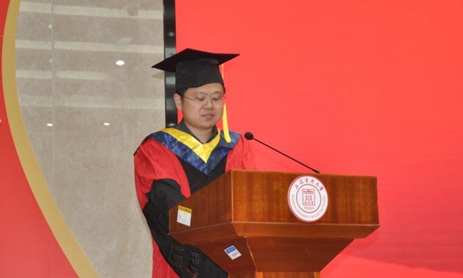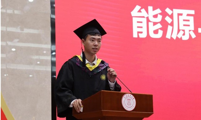刘文扬作为员工代表发言。他回顾着在学校学习生活的点滴记忆,在教室里绘制工图;在图书馆里埋头苦读;在操场上奔跑;在湖畔散步……通过诉说青春和过往来表达对母校的感恩、不舍和依恋。他代表毕业生表态:要立志做无私奉献、锐意进取的追梦人,以奋斗有我、强国有我、功成有我的姿态,激荡起新时代的澎湃春潮。