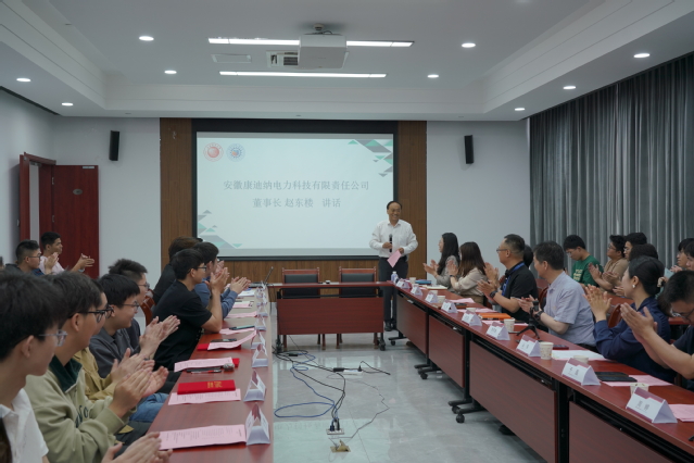 赵东楼先生在讲话中分享了自身学习和成长经历,讲述了自己始终坚持学习、挑战自我的毅力。同时,与现场的同学们分享对未来工作的展望,叮嘱同学们要充分利用好大学这段宝贵的时间,不断学习专业知识、打牢基础,做情商、智商双高的新时代优秀青年。最后也对老师同学前往安徽康迪纳电力科技有限责任公司参观交流表示热烈欢迎。
