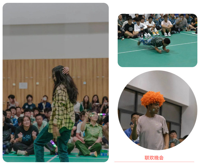 晚会过半,各连教官提着带有连队口号的蛋糕,在全场热烈的欢呼下进入会场。他们将自己真挚的祝福传达给每一位新生——心怀梦想报效国家。随后全体教官带领同学们集体合唱《最炫民族风》,将会场气氛推向高潮。在教官们与同学们的阵阵歌声中,大家一同切开蛋糕,点燃蜡烛,彼此留下美好的祝福。晚会最后,全体师生与教官合拍集体照,此刻,定格军训的苦乐回忆,传递真挚的“师生”感情。