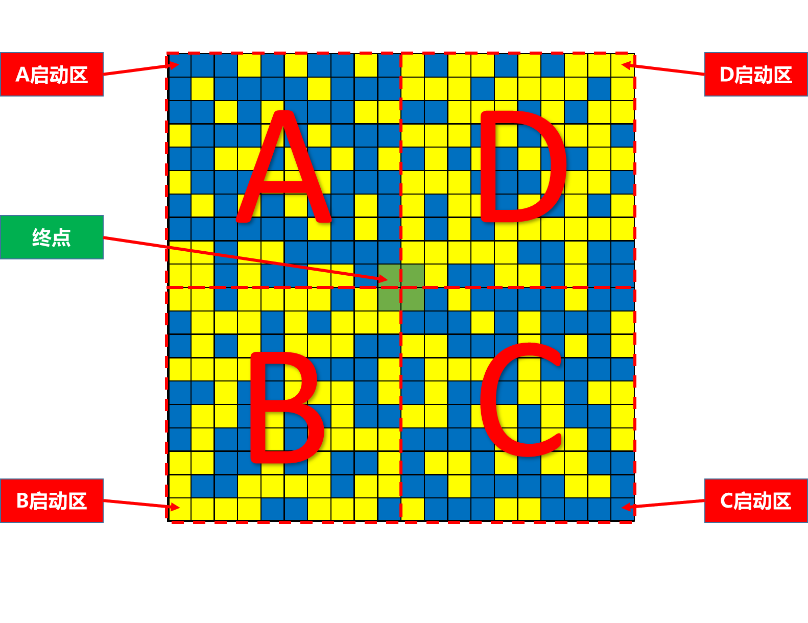 4.迷宫分为A、B、C、D四个区域,地图的四个角是启动区,中心的绿色为终点,每次4支队伍同时比赛;