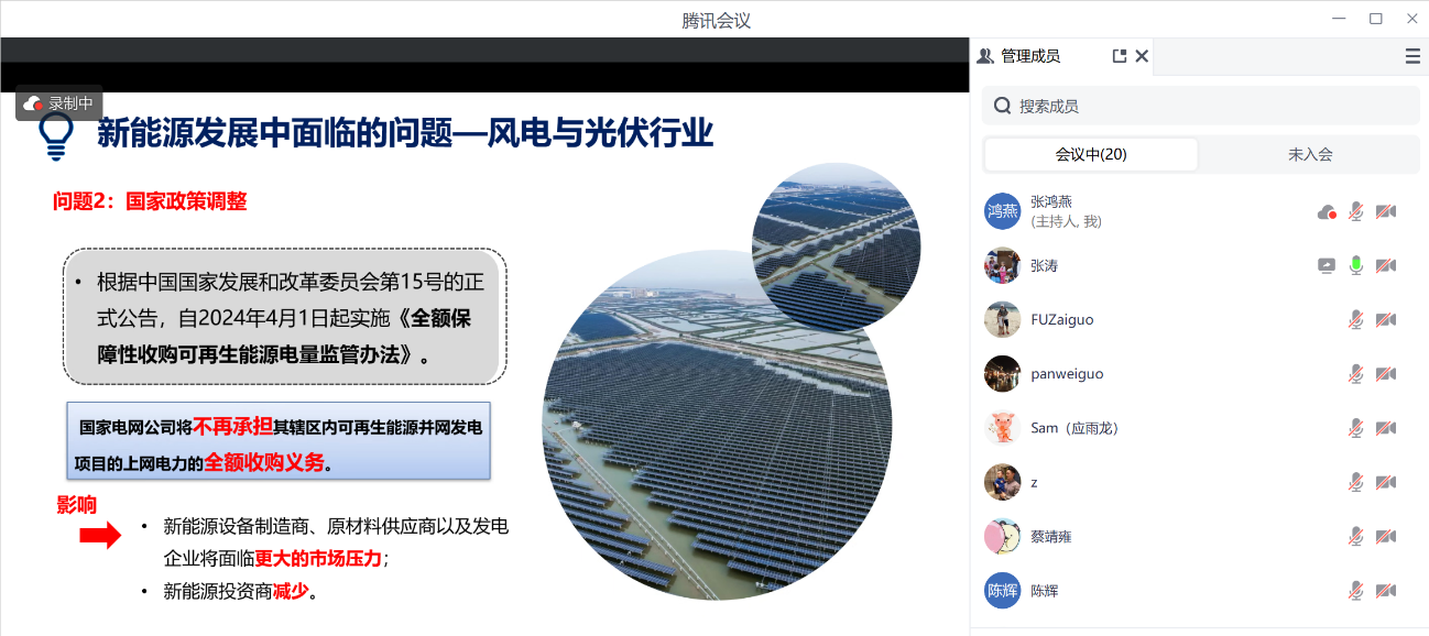 新能源子团队成员张涛老师作《新能源发展下的机遇和挑战》专题报告。他以详实的数据和技术动态对风电与光伏、储能及新能源汽车的快速发展现状及未来发展方向进行了阐述,并提出当前新能源产业在发展中面临着消纳压力凸显、国家政策调整、储能配比滞后于可再生能源发展三大问题。基于新能源产业瓶颈问题,他介绍了当前子团队在新能源和储能方面的三大聚焦研究方向,助力实现新能源发展背景下科学研究的融入与破局。
