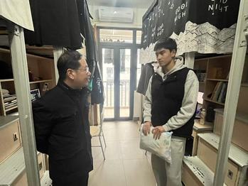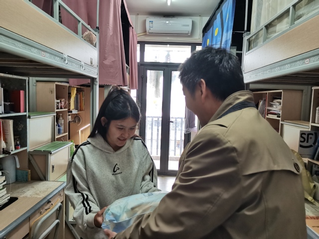 在员工宿舍内,潘卫国亲切询问新生对大学新环境的适应情况和3个月以来的学习状况,同学们纷纷回应自己在校的学习和生活情况,并表示已基本适应在老员工活。潘卫国叮嘱同学们寒冬来临要注意保暖,并送上学院为大家准备的毛毯。在询问同学们家中情况的同时,鼓励大家勇敢面对生活中的困难,把暂时的困境当作成长的磨砺,学院将永远是大家最大的支持和保障。